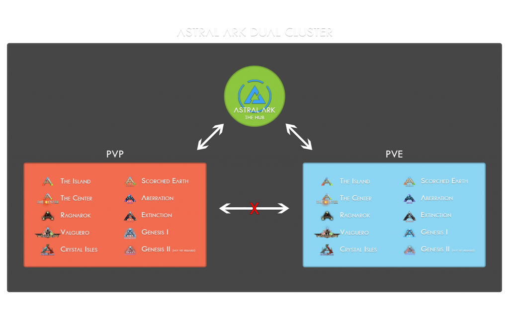 We are moving to a unique dual PVE-PVP cluster, consisting of two sets of all official maps (9 PVE & 9 PVP) along with the Astral ARK map acting as the central hub. This will bring us to a total of 19 servers, soon to be 21 with the Genesis II release.