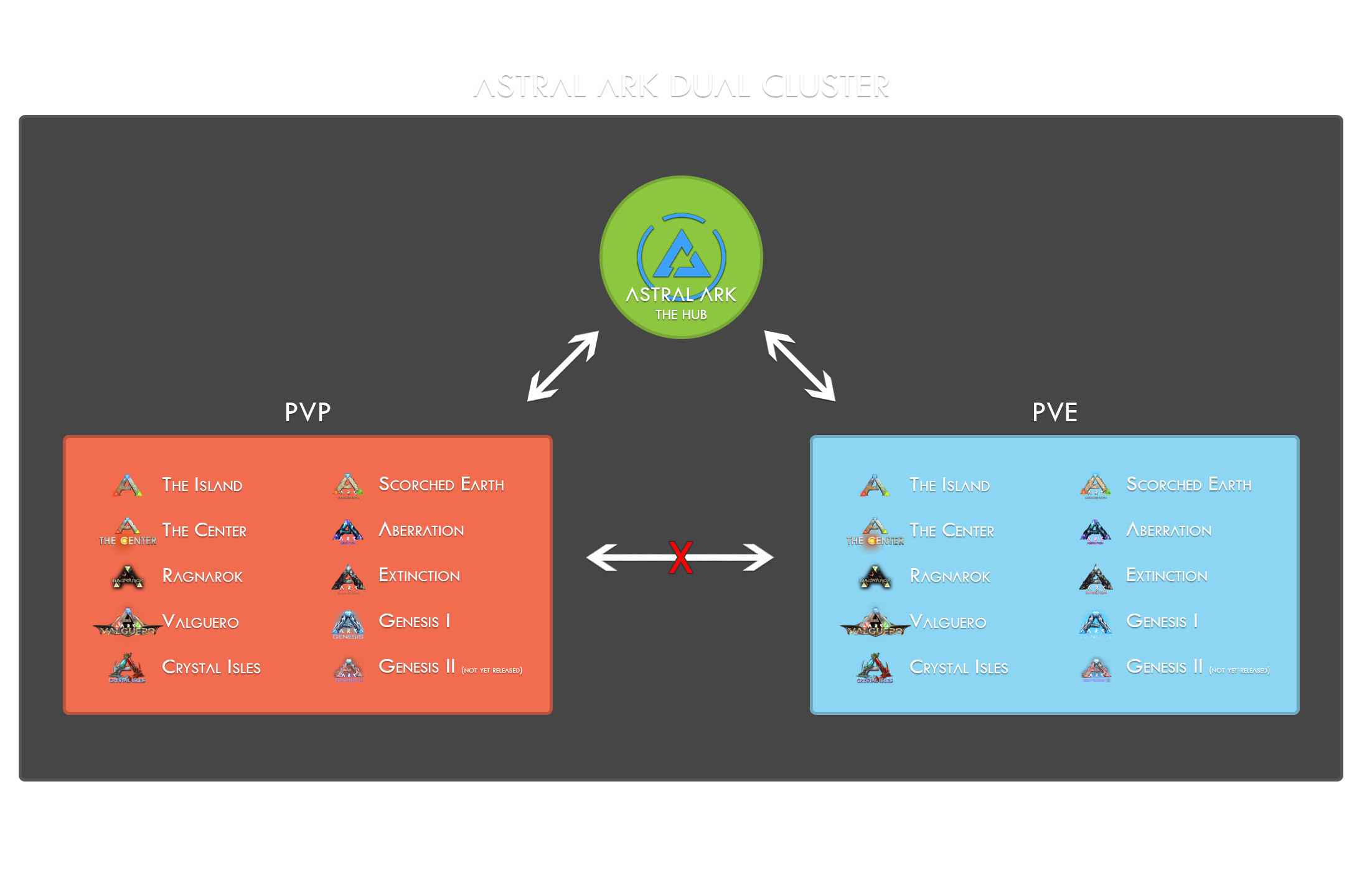 We are moving to a unique dual PVE-PVP cluster, consisting of two sets of all official maps (9 PVE & 9 PVP) along with the Astral ARK map acting as the central hub. This will bring us to a total of 19 servers, soon to be 21 with the Genesis II release.